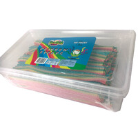 Carton of 1kg x 8 Each tubs with 135 pieces of big mouth watering sour straps. Colourful and playfull in a large resealable plastic tub. These are great fun and good chewing. Watch the kids get inventive.