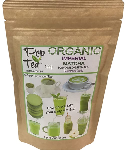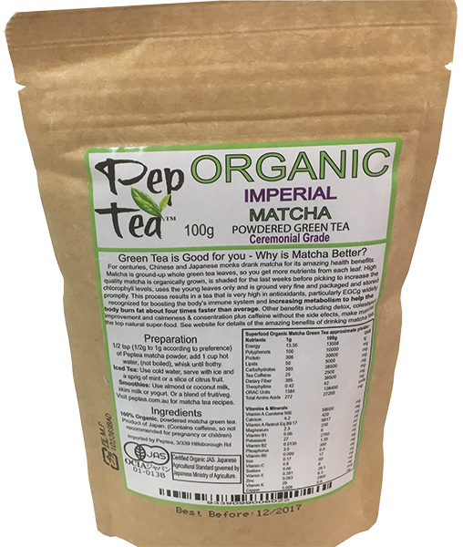 Pep Tea brand Matcha 100g and 1kg bulk packs are foil lined, re-sealable pouches that stand up with front labels that show the most popular ways people take their matcha tea, and back labels that explain the difference between matcha tea and traditional green tea, to enable best presentation in your store. The back label also shows the organic certification logo of the Japanese ministry of Agriculture.