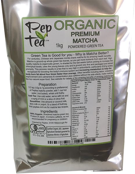 Pep Tea brand Matcha 100g and 1kg bulk packs are foil lined, re-sealable pouches that stand up with front labels that show the most popular ways people take their matcha tea, and back labels that explain the difference between matcha tea and traditional green tea, to enable best presentation in your store. The back label also shows the organic certification logo of the Japanese ministry of Agriculture.